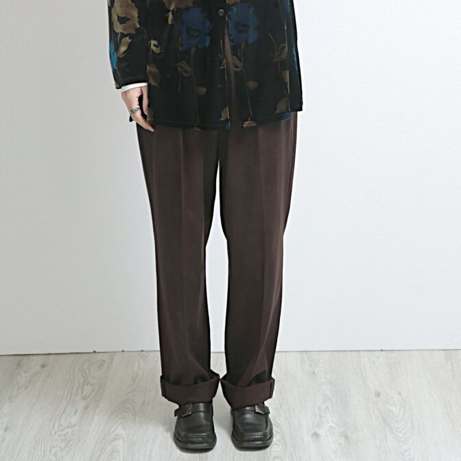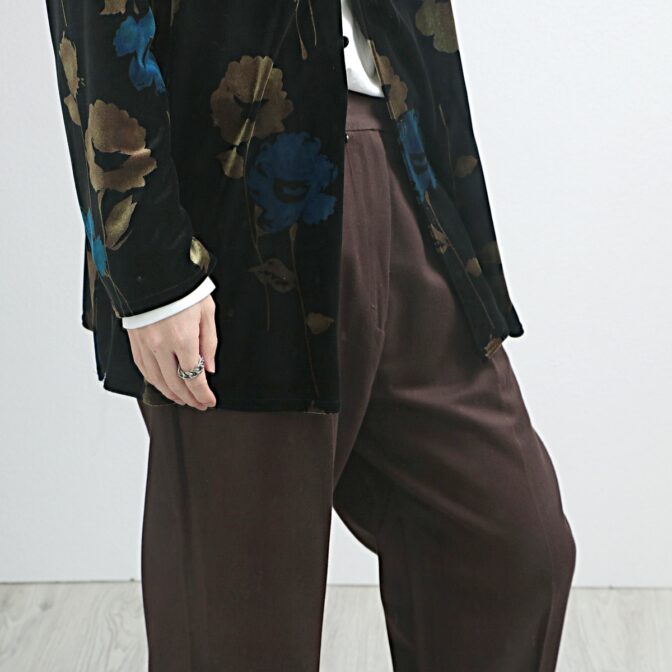ゆとりを持たせた2タックと両玉縁仕様のポケット。後ろ姿も片側フラップ、スラックス要素あるアクティブボトム。裏地は無い仕様です。