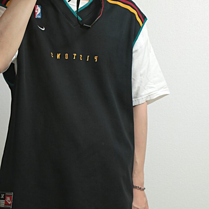 ブラックカラーにピストンズとナイキの刺繍と3色のカラーがアクセントにトリミングされたタンクトップ。