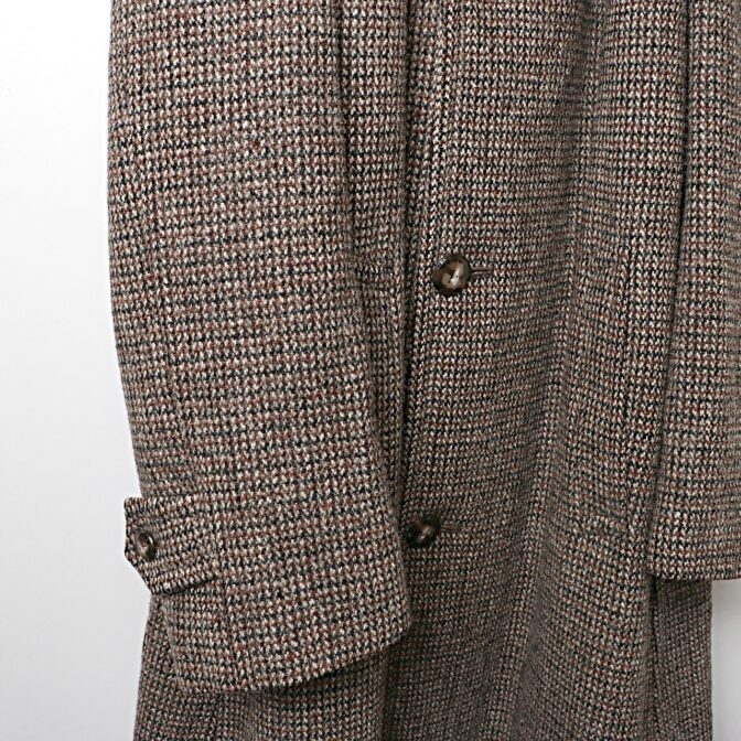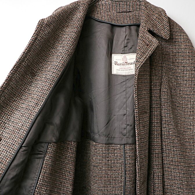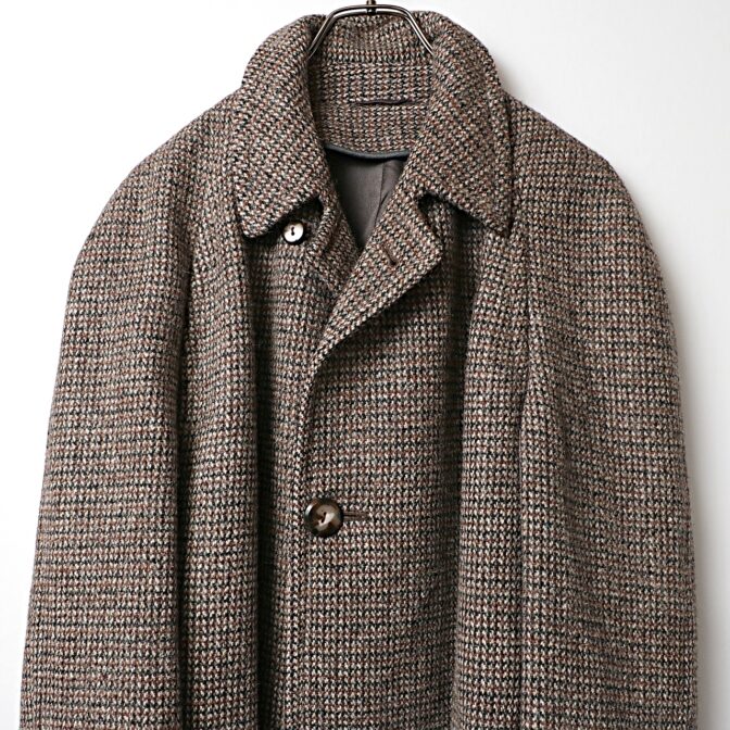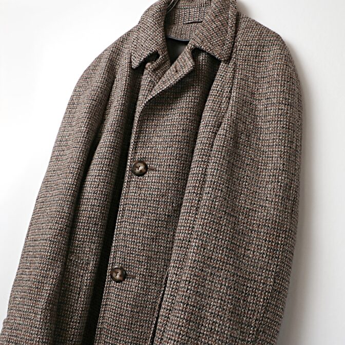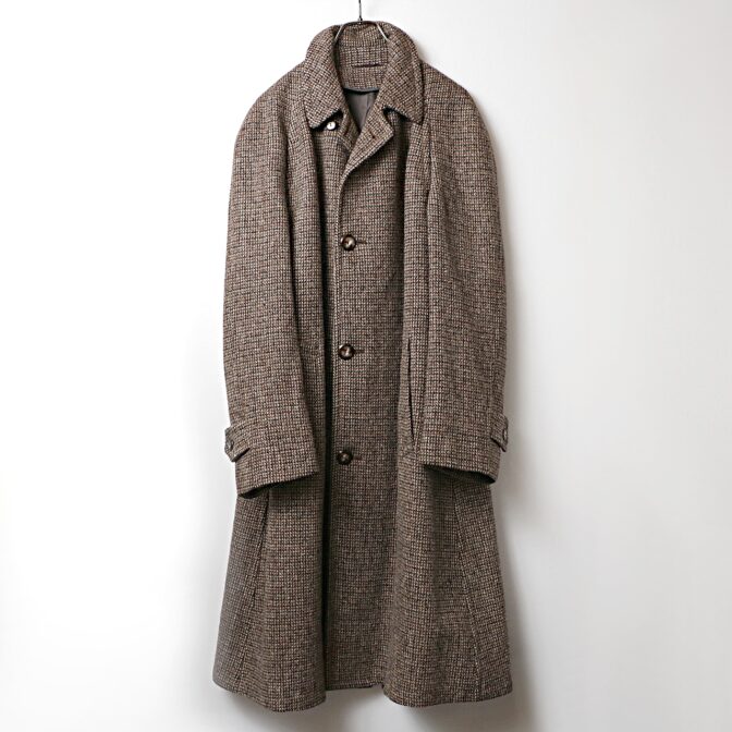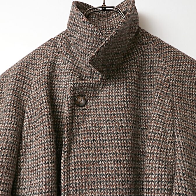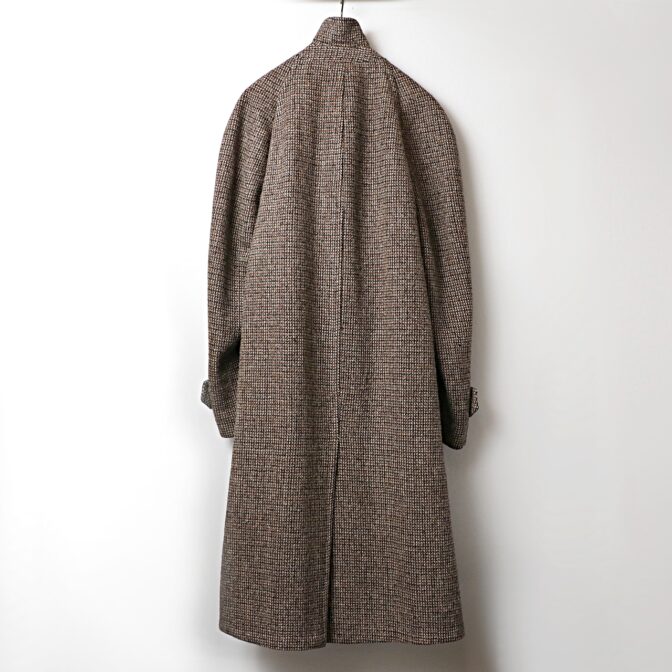 ブラウンベースの重厚なヘヴィウールのハリスツイードを使ったラグランスリーブロングコート。