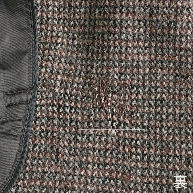 古着の為、使用感は御座います。袖部分に目立たない程度の小穴。画像にあるポケット付近にリペア跡。裏も見えるコートですが、しっかりと芯地を張り裏側も目立たない程度に直しているので古着慣れしている方であれば十分ご利用頂けるかと思います。 |